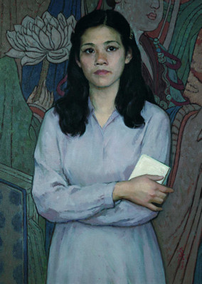 1979年,当时我住在朝阳门外三里屯,隔壁邻居小高是从香港回来的广东人,形象比较有特点,我给她画了一张写生肖像。 在这幅作品中,主要想研究中国传统艺术中的装饰韵味。我发现永乐宫壁画中线的运用非常突出,有着独特的韵律感。这是我第一次用永乐宫壁画作为背景,我想用油画的技法表现出中国式的装饰风格。 我设计的人物动势单纯。两臂环抱,一只手拿着书,整个肖像用平光处理。试着突出线的作用,人物服装是浅灰色,背景是永乐宫壁画较深色的部分与人物形成对比。