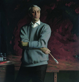詹建俊是我的老同学、老同事,我们从1949年北平国立艺专开始同学,一起走过了半个世纪。我家住在中央美院王府井68号院时,他也是我的邻居。他是一个很出色的画家,成名很早,他后来一直担任中国油画学会的主席。 1994年我去了俄罗斯,欣赏了大量欧洲及苏联时期的绘画,有两个人的作品对我影响很大。约干松的《老乌拉尔工厂》和柯林画的一批俄罗斯知识分子的肖像,我印象深刻。在我的朋友中,我喜欢詹建俊的画风,因为他的画色彩浓烈,造型硬朗,我对他本人也很熟悉,我就想做一个新的试验。尝试用柯林强烈、坚硬的风格表现詹建俊,不仅要表现出他的个性气质,还要把他本人的绘画风格融进去。 1994年我请他到我家里,请他自己摆动作。我画了很多次速写,最后决定构图之后,我又画了一张素描头像。 这张画比我其他作品造型方和硬,色彩也比较强烈。虽然画了几个月,可是还达不到柯林强烈的程度,因为柯林的强烈是我非常向往的风格,但我做不到,这是我个人气质决定的。尽管如此,这张作品在我的画中,色彩已经算是强烈的。